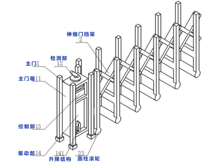驅(qū)動(dòng)部包括升降結(jié)構(gòu)、驅(qū)動(dòng)電機(jī)和主動(dòng)輪,所述驅(qū)動(dòng)電機(jī)設(shè)置在箱體的后端,且所述驅(qū)動(dòng)電機(jī)與箱體固定連接,所述主動(dòng)輪設(shè)置在箱體的下端面,且與箱體滑動(dòng)連接,主動(dòng)輪設(shè)置在升降結(jié)構(gòu)的下端,且與升降結(jié)構(gòu)固定連接,用于驅(qū)動(dòng)開啟和關(guān)閉伸縮門。