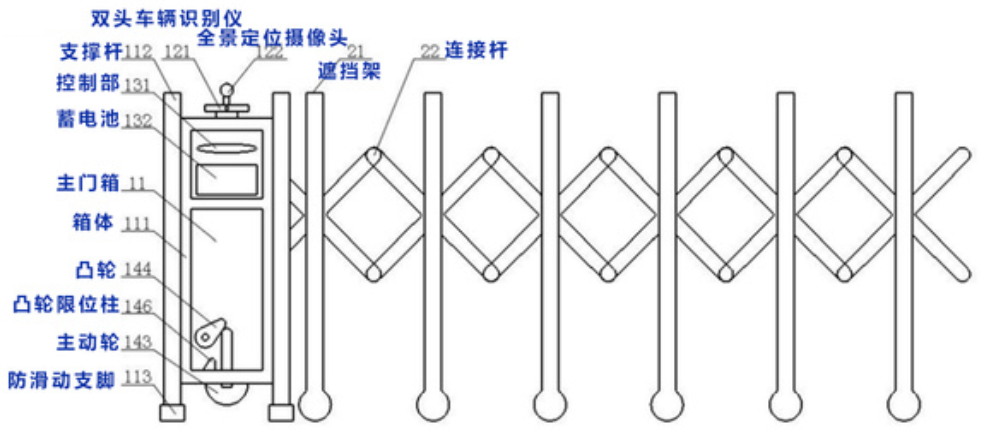 一種車牌識(shí)別開啟的伸縮門,包括伸縮門主門和伸縮門擋架,伸縮門主門包括主門箱、檢測(cè)部、控制部和驅(qū)動(dòng)部,主門箱包括箱體和支撐桿,支撐桿的數(shù)量為四根,且四根支撐桿均勻焊接在箱體的四個(gè)邊角,檢測(cè)部設(shè)置在主門箱的上端,且與主門箱固定連接,控制部設(shè)置在主門箱的內(nèi)部,且與主門箱固定連接,控制部分別與檢測(cè)部和驅(qū)動(dòng)部電性連接,所述驅(qū)動(dòng)部設(shè)置在控制部的下端,且與主門箱固定連接,伸縮門擋架設(shè)置在伸縮門主門的左側(cè),且與伸縮門主門固定連接,伸縮門擋架為旋轉(zhuǎn)折疊結(jié)構(gòu),包括遮擋架、連接桿和圓柱滾輪,連接桿設(shè)置在遮擋架中間,且與遮擋架轉(zhuǎn)動(dòng)連接,圓柱滾輪設(shè)置在遮擋架的底部,且與遮擋架轉(zhuǎn)動(dòng)連接。